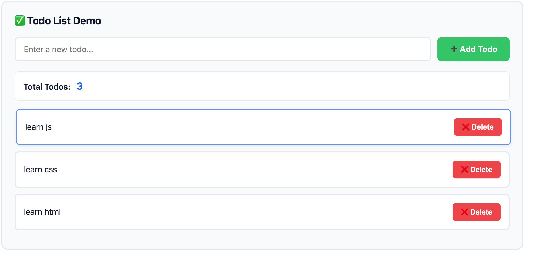 addTodo()with the trimmed value - Step 6: Clear the input field by setting